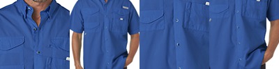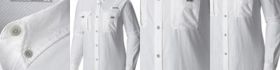 3.8 oz., 100% cotton poplin; Self-adhesive collar points; Vented; Utility loop; Columbia PFG logo patch on rod holder on left chest; PFG logo patch on center back.