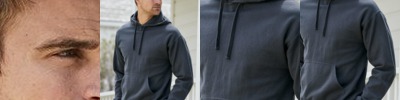 - Solid fleece body with charcoal fleck hood, drawcord and sleeves