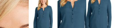 This soft, flowy tunic has professional edge with its woven front and knit back.