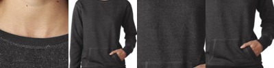 8 oz., 55% cotton, 25% metallic yarn, 20% polyester French terry; Glitter knit and cover-stitched throughout; 2x1 rib-knit cuffs; Waistband and pocket openings; Extended back length;