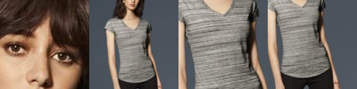 - Single-needle topstitched front neck with ½” rib v-neck collar
