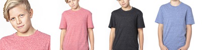 4.2 oz./yd., 142 gm/m., 30 combed ring-spun singles; White, Black, Charcoal, Navy; Tri: Black, Royal Blue, Cranberry, Navy, Plum, Light Asphalt, Indigo, Midnight, Steel Blue are: 50% cotton, 25% polyester, 25% rayon; Tri: Athletic Grey, Dark Grey, Denim, Burgundy, Kelly Green, Olive, Fuchsia, Charcoal, Blue Berry, Hunter Green are: 50% cotton, 38% polyester, 12% rayon; Tear-Away Label; American fabrics, assembled in Mexico;