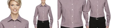 4.1 oz., 60% cotton, 40% polyester; fine yarn count shirting; true Non-iron performance straight from the dryer; patented pucker-free seams; specially fused collar, cuffs and placket; split back seam with bias cut back yoke; pearlized buttons; straight collar; front and back princess seams for flattering feminine fit; bust darts for a flattering feminine fit.