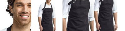 6.9 oz., 100% cotton twill; chino style stitched pockets with rivets; gun metal eyelets secure 35" self fabric ties; top centre pocket; neckband with buckle and adjustable snap button fastening; 34"L x 28"W; Oeko-Tex® Standard 100 certified; WRAP certified;