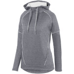 7.1 ounce 100% polyester tonal performance wicking fleece * 100% polyester performance wicking fleece solid contrast color piping detail * 3.35 ounce, 100% polyester mesh hood lining * Wicks moisture * Ladies' fit * Tagless label * Scuba shaped 3-piece hood with contrast color mesh lining and heathered tipped drawcord on sizes M-2XL only * Raglan sleeves * Front pocket with an interior pouch pocket * Self-fabric cuffs and bottom band * Dropped tail * Open bottom